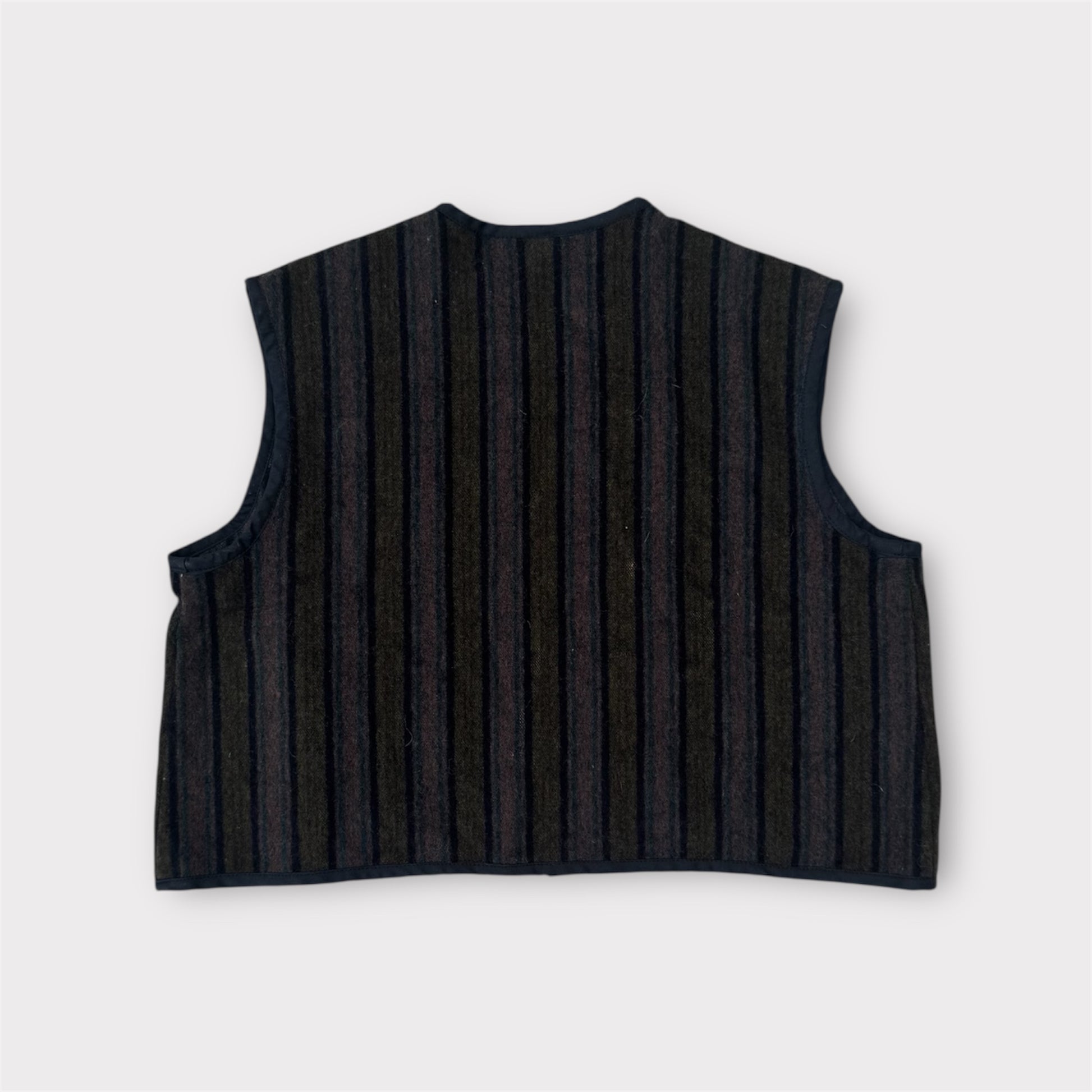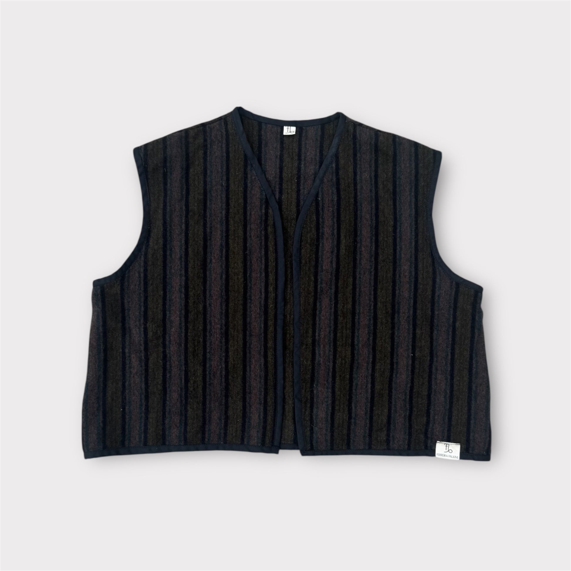 Boléro ample à rayures verticales, confectionné à partir de textiles récupérés. Son style sobre et graphique en fait un essentiel facile à porter au quotidien. Modèle unique.