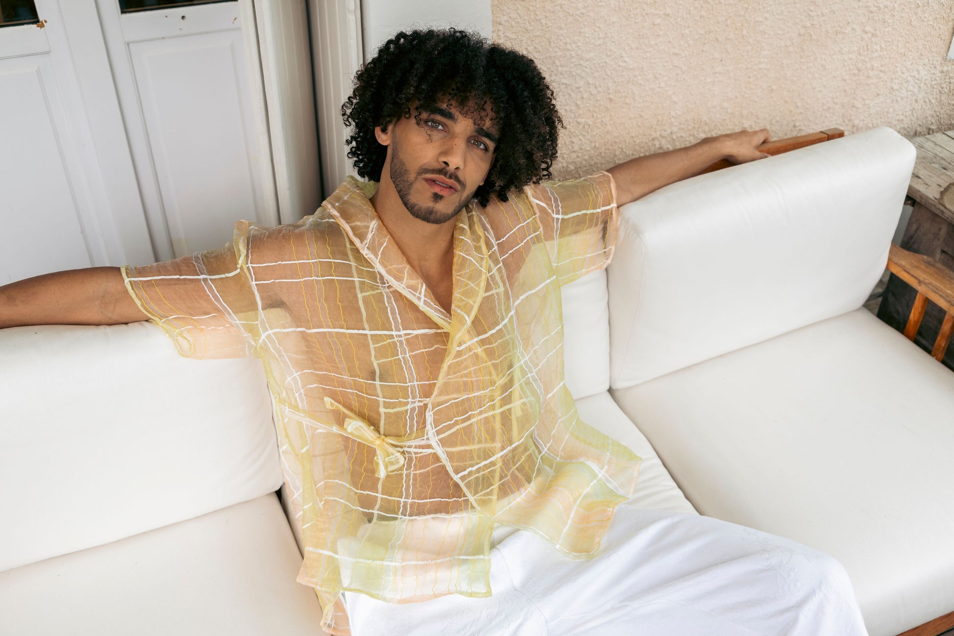 Pièces unique - Chemise croisée au col châle, façon kimono, manche courtes. Se noue afin d'ajuster la taille. Dans un tissu transparents a carreaux au tons jaune pour une touche d'audace et de douceur.