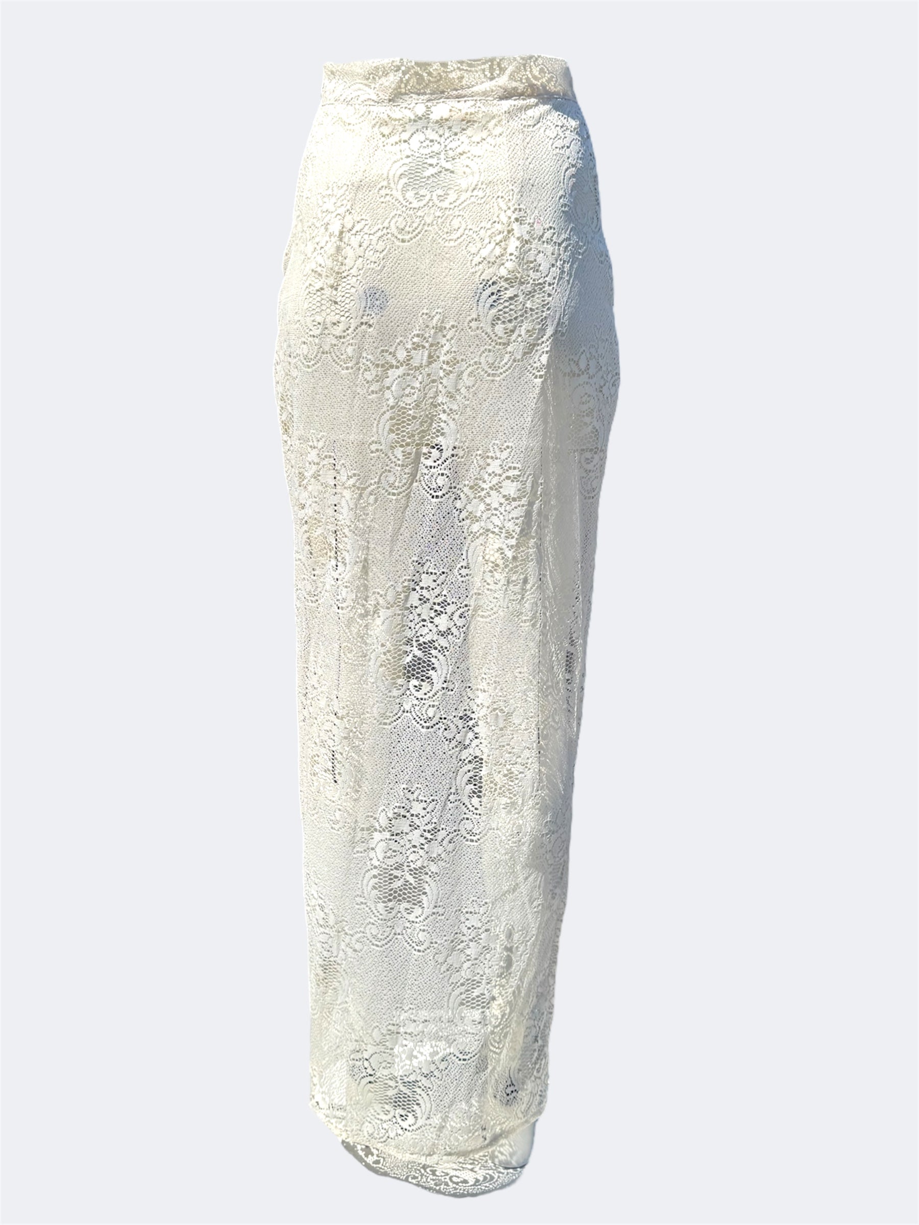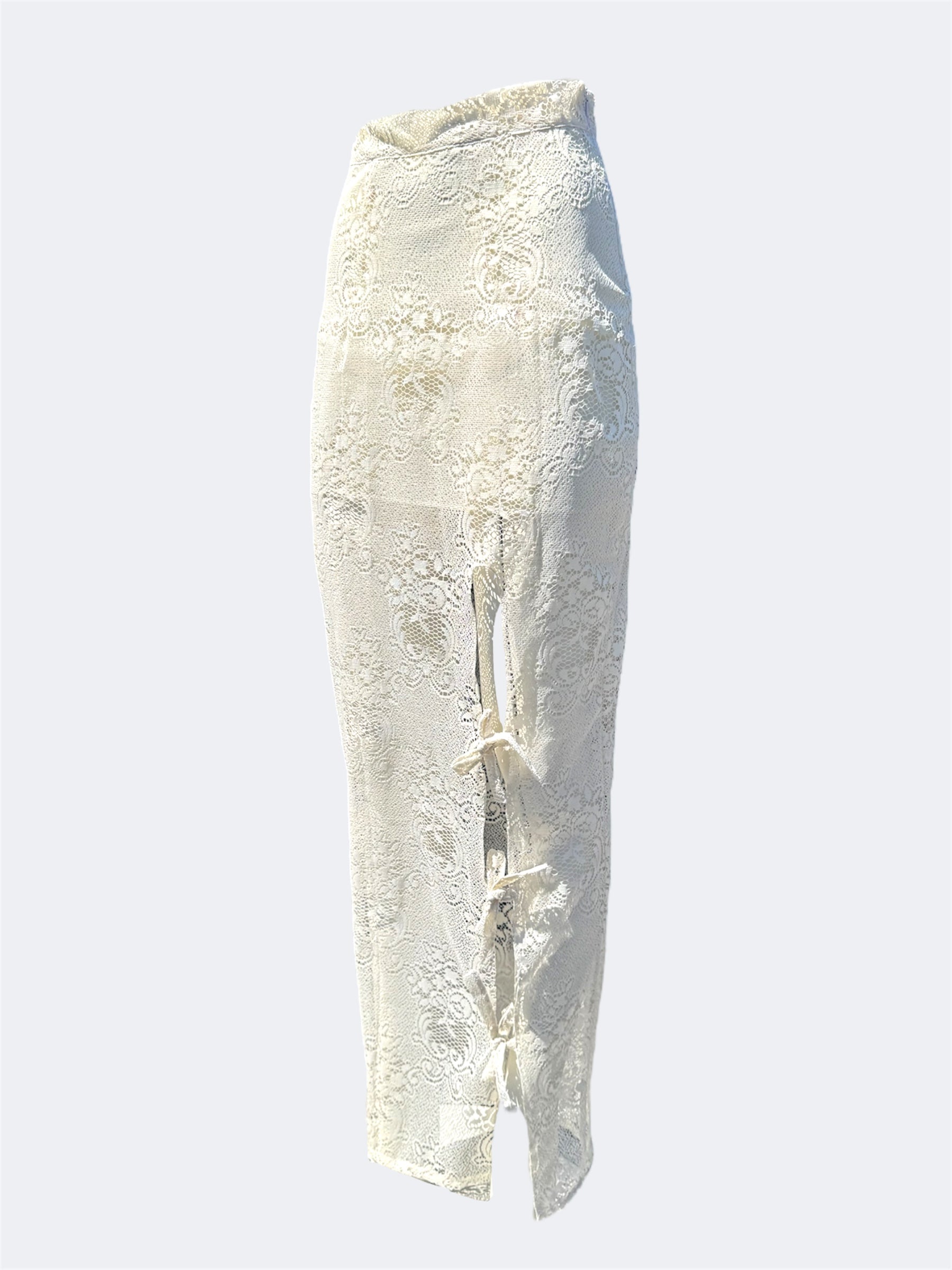 Jupe longue taille haute s’ouvre par un zip invisible sur le côté pour un look audacieux et élégant. Une fente qui se noue par des liens sur le devant réaliser à partir d’un rideau de salon.