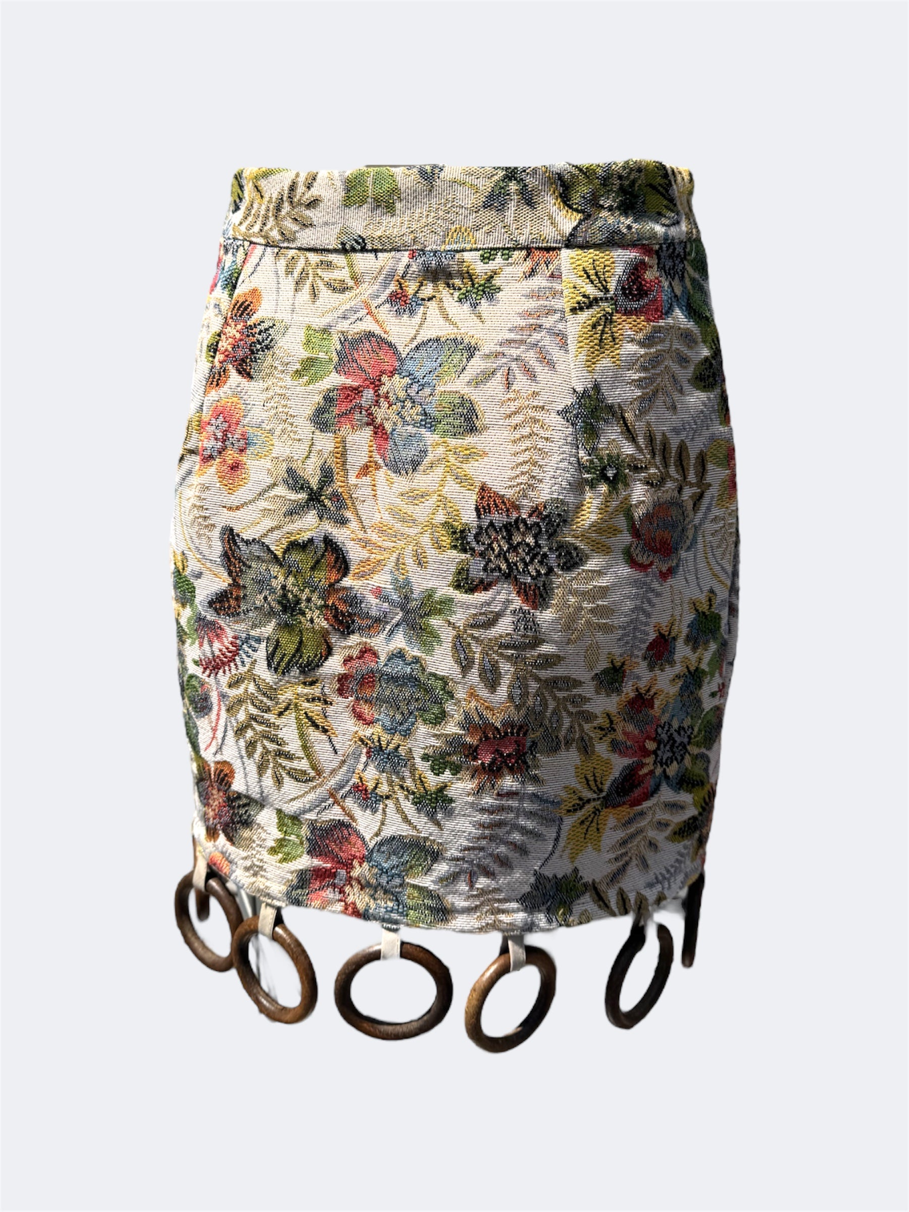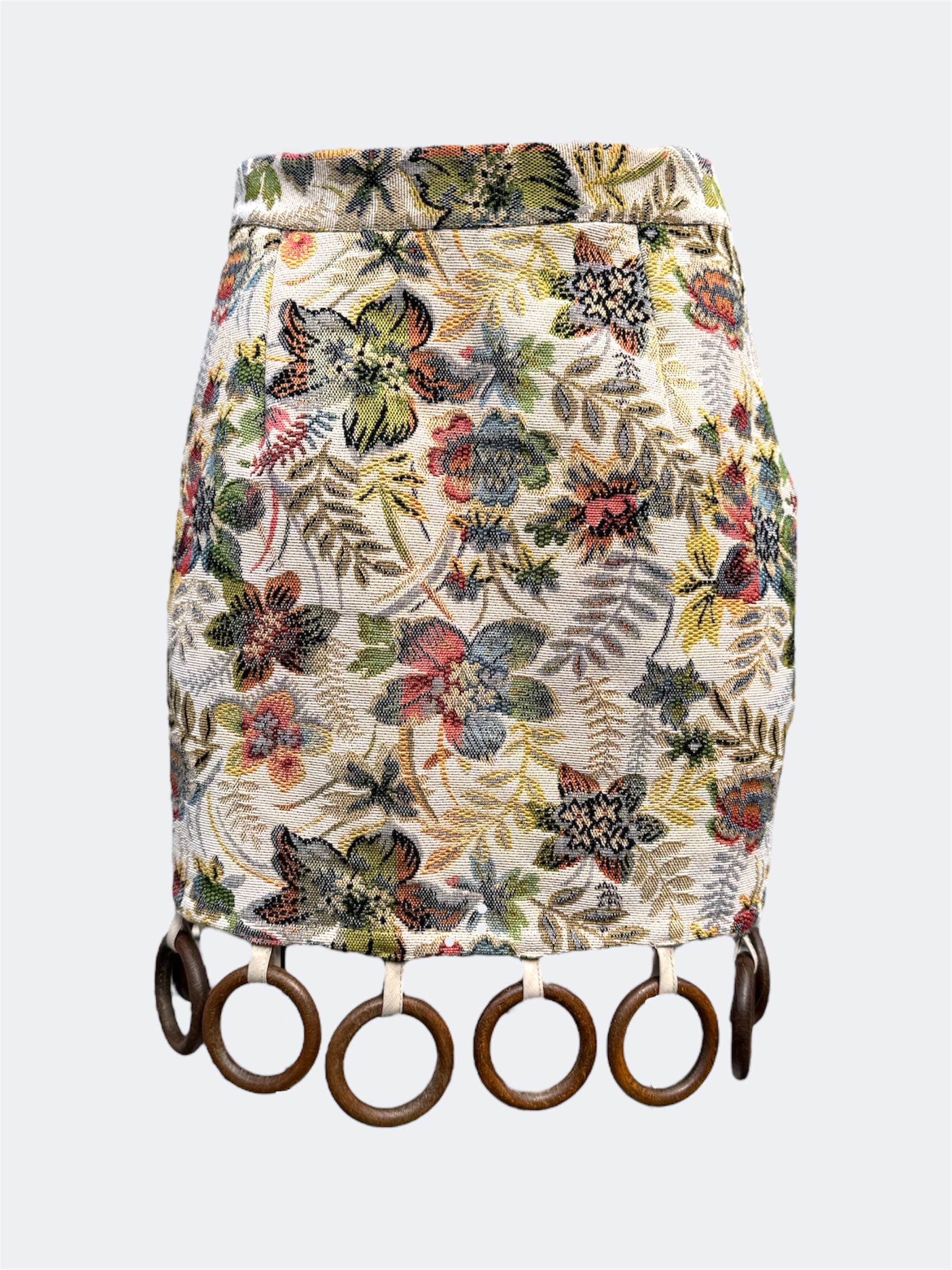 Jupe courte conçue à partir d’un rideau à motif tapisserie fleurie, ornée d’anneaux de rideau en bois. Pour un look audacieux et unique.