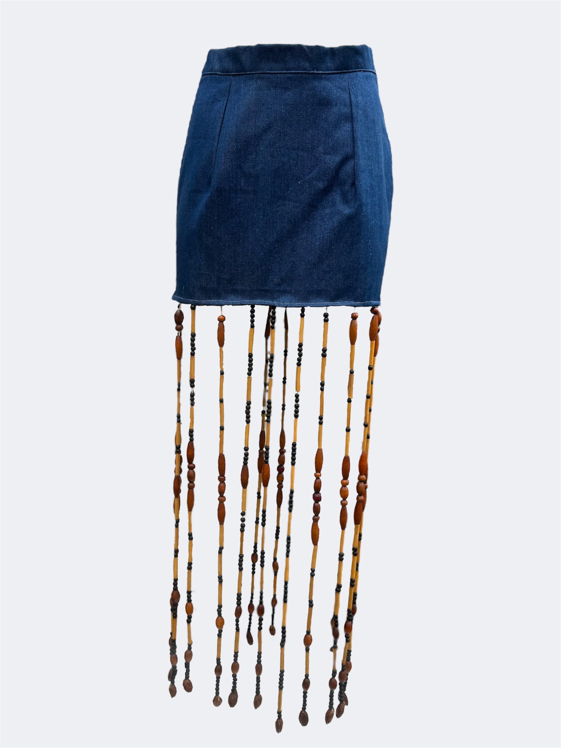 Jupe créé à partir de chute de denim. Elle est ornée de frange en bois, de rideaux anciens une pièce forte et originale.