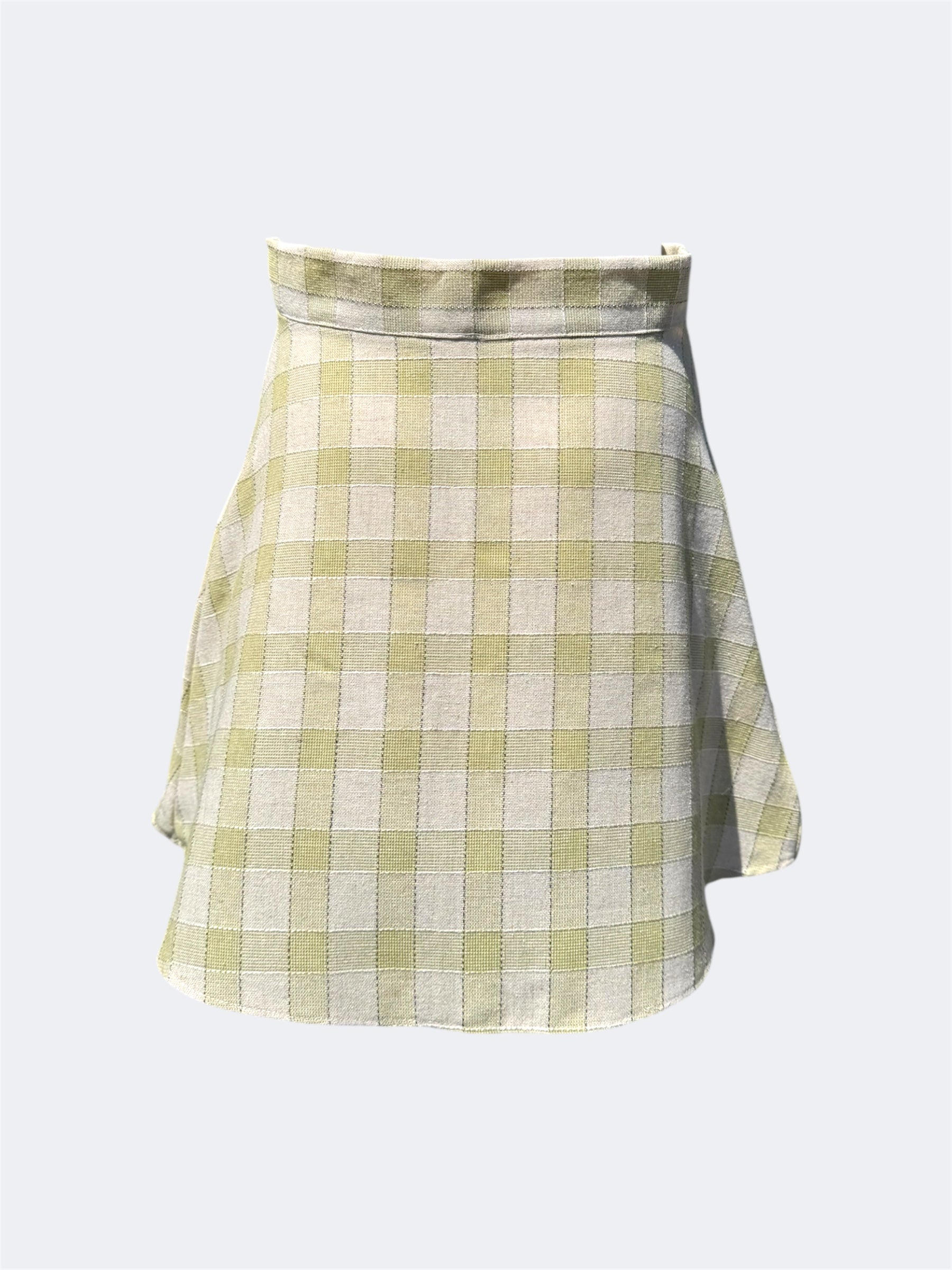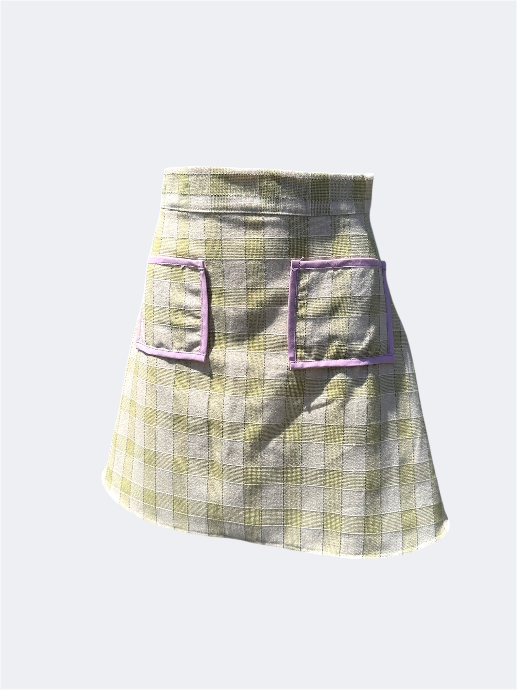 Jupe courte évasée à carreaux en linge valorisé, avec deux poches ornées d'un biais rose. Une coupe droite pour un look rétro.