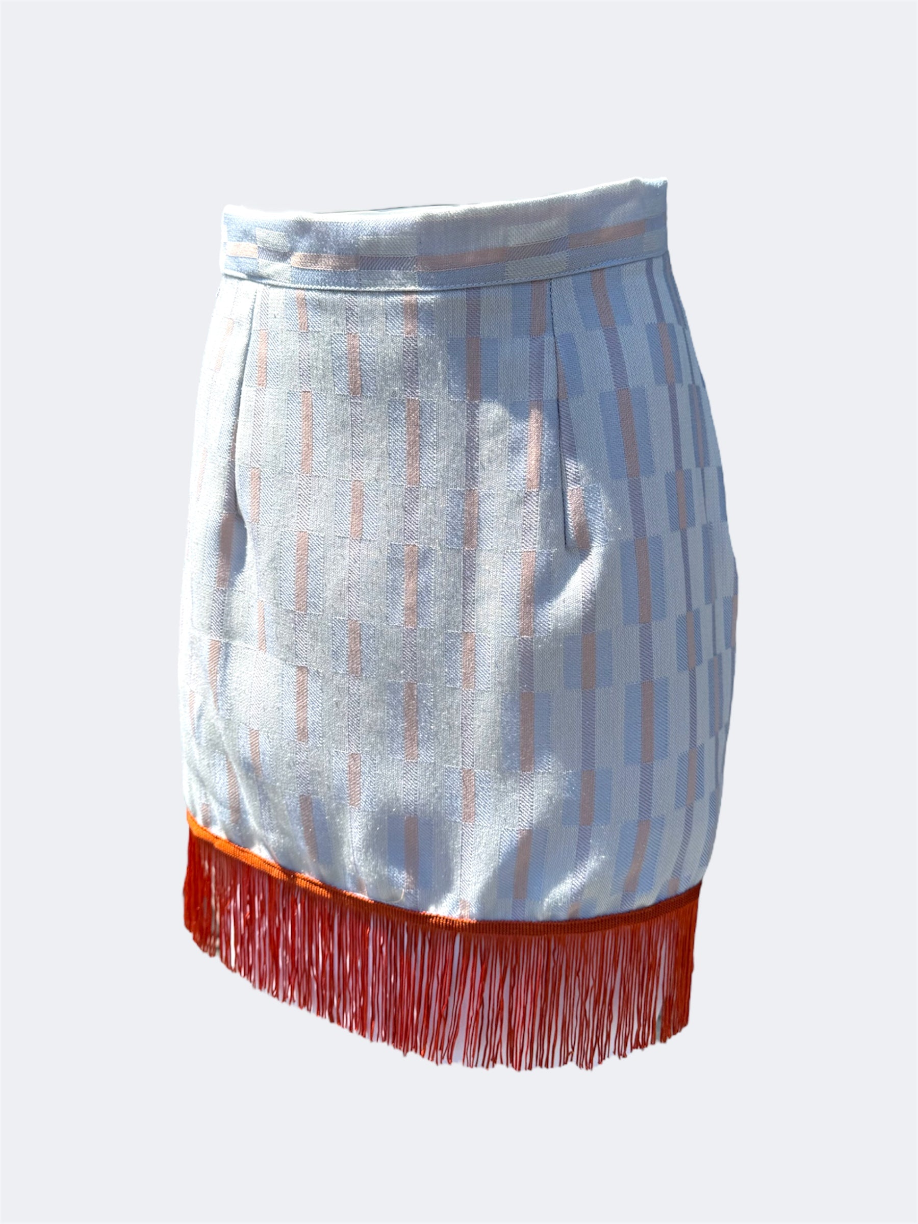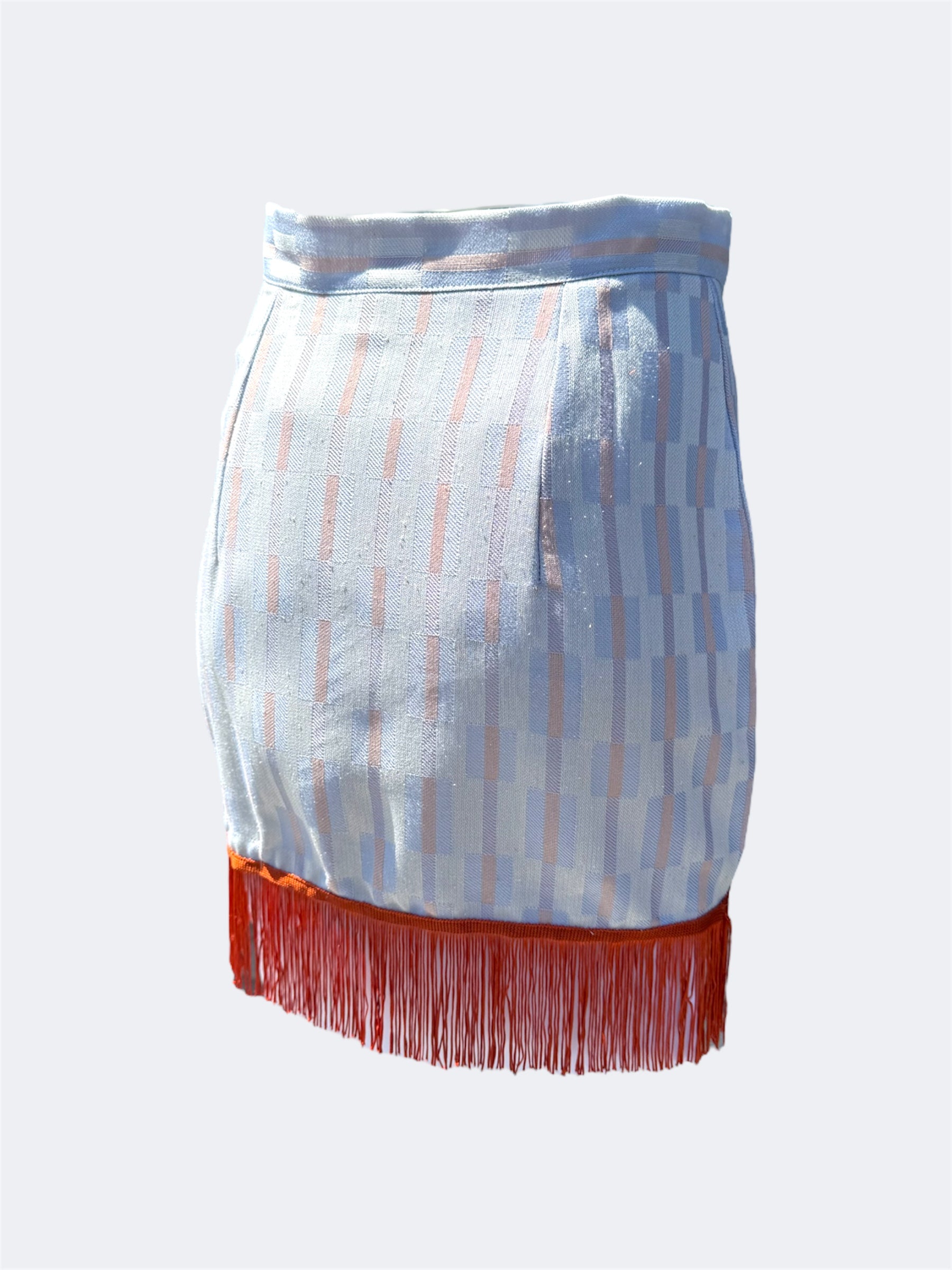 Jupe courte de couleur pastel et à motifs géométriques. Suivie de ses franges couleurs brique qui apportent du mouvement et une touche d’originalité.