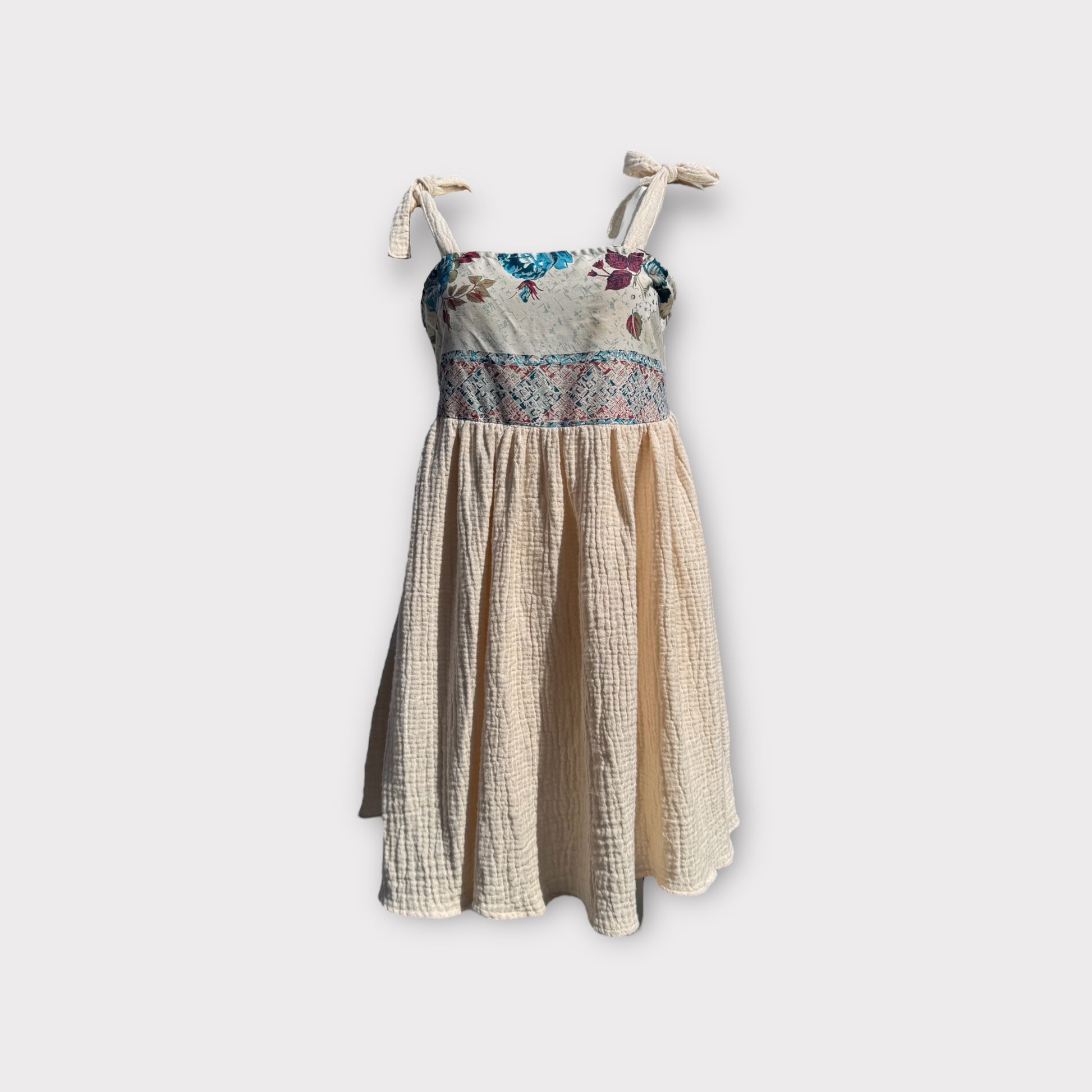 Mini-robe en gaze de coton beige, conçue à partir d’un drap et d’une nappe fleurie, mêlant charme rétro et engagement éthique.