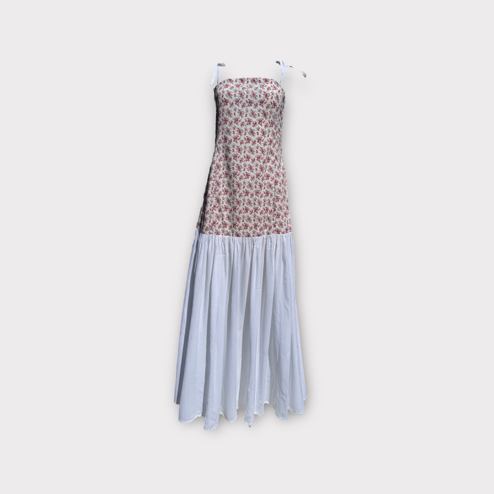 Longue robe créée à partir d’un drap fleuri, ornée d’une jupe blanche. Pour un look délicat.
