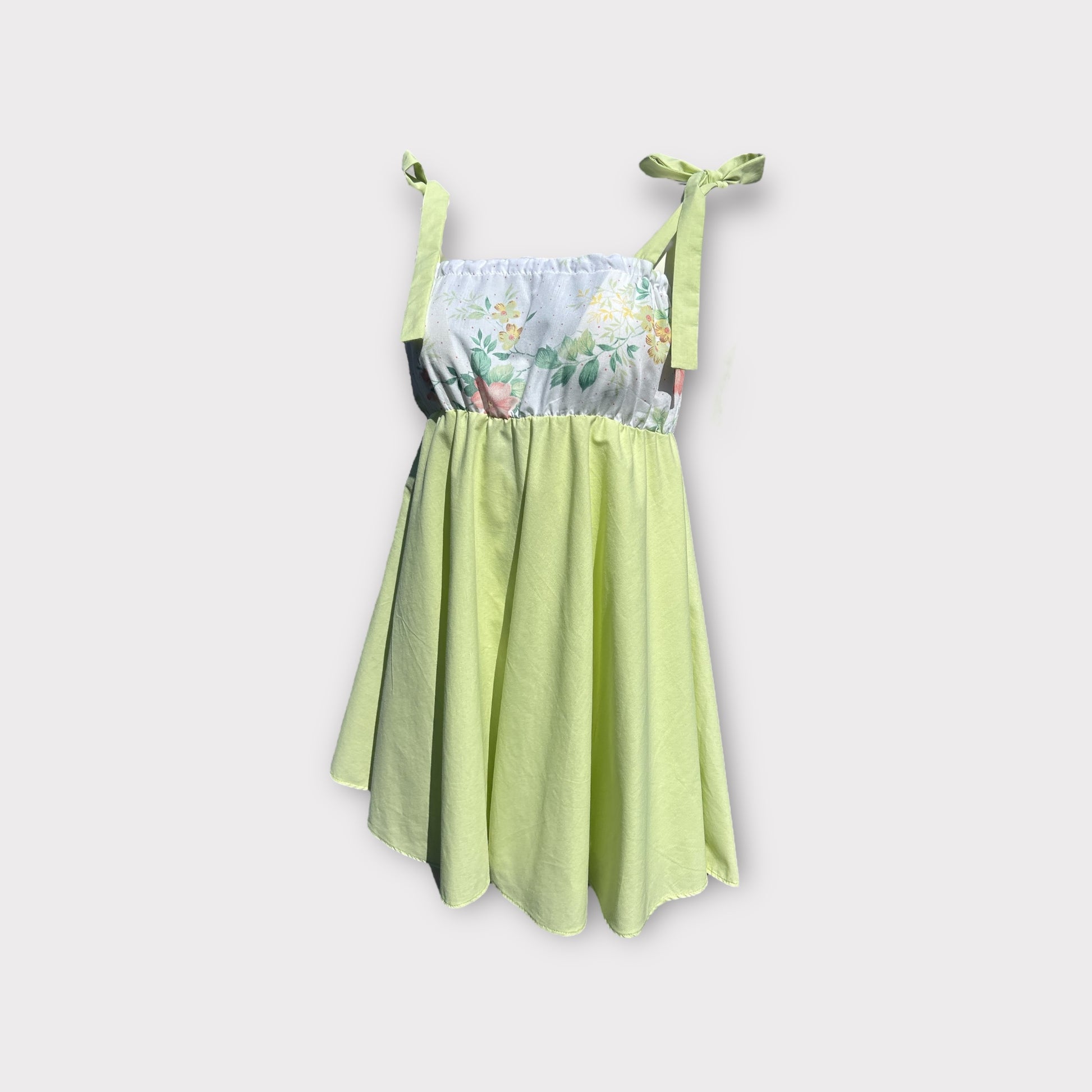 Mini-robe verte à motif fleuri, rehaussée de nœuds aux épaules pour une touche délicate, parfaite pour l’été.