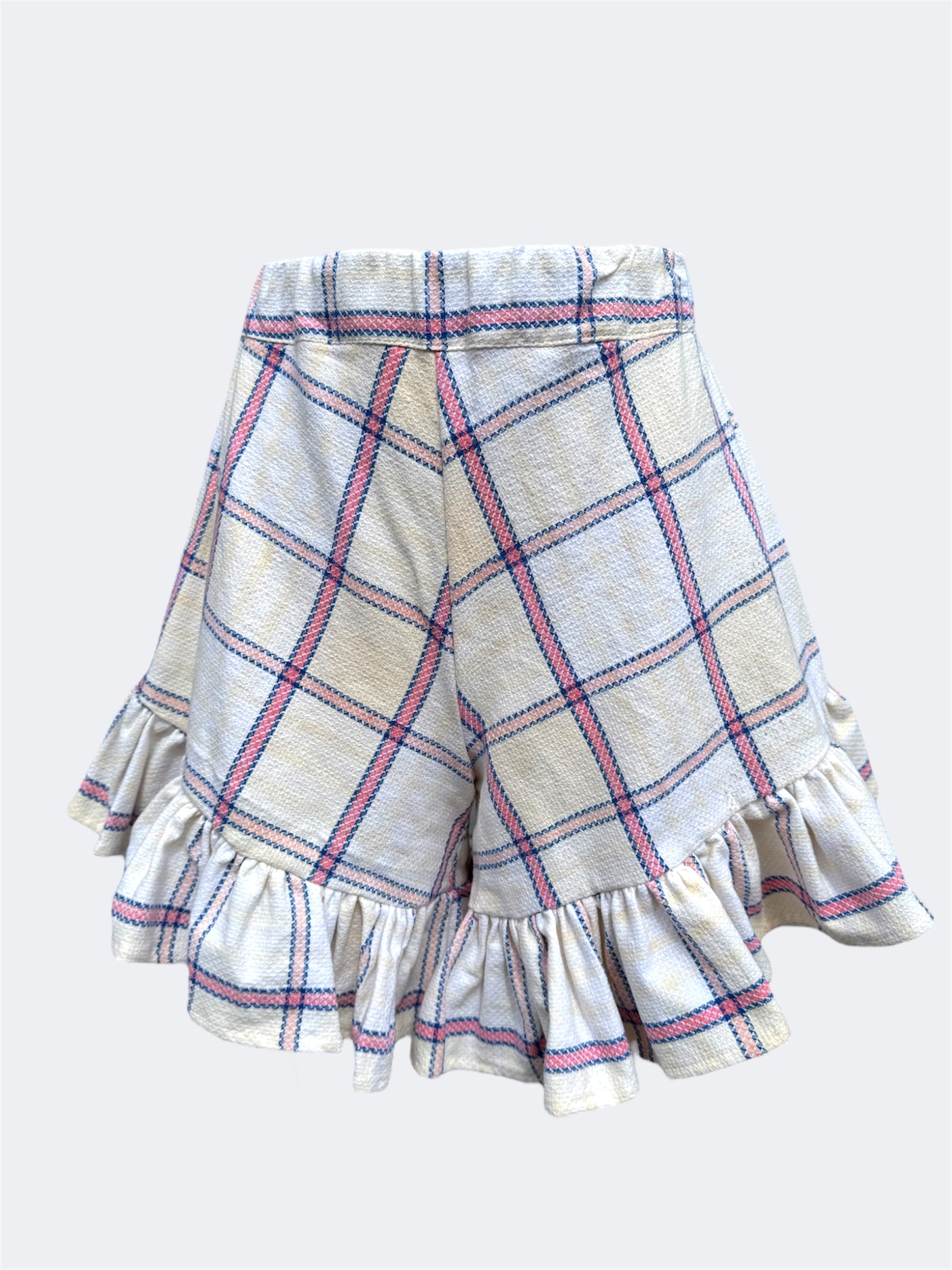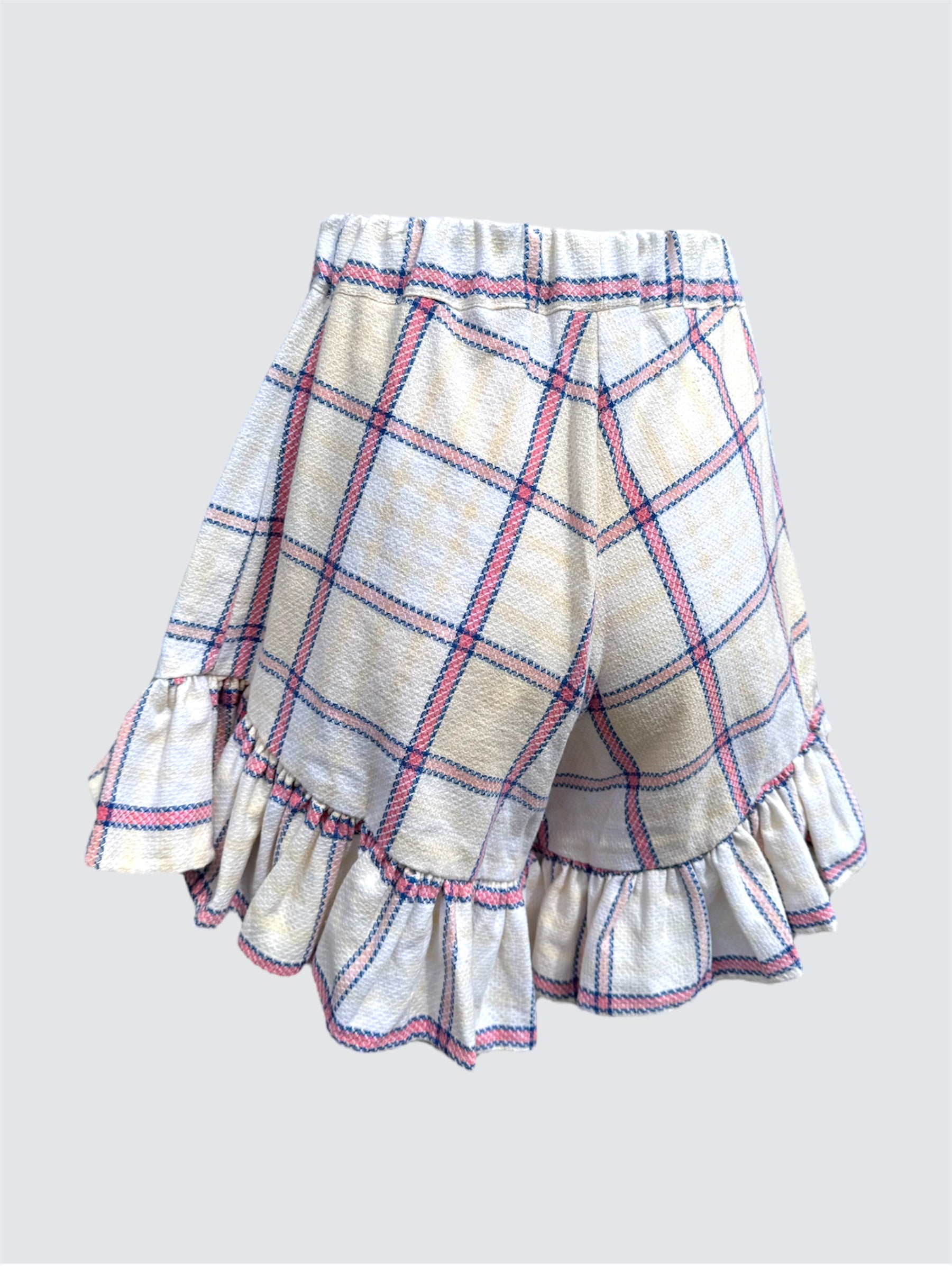 Short réalisé à partir de textile oubliés dans les tons violet au multiple carreaux. Sa taille élastiqué apporte confort. Fini par un volants, cela pour un style estival.