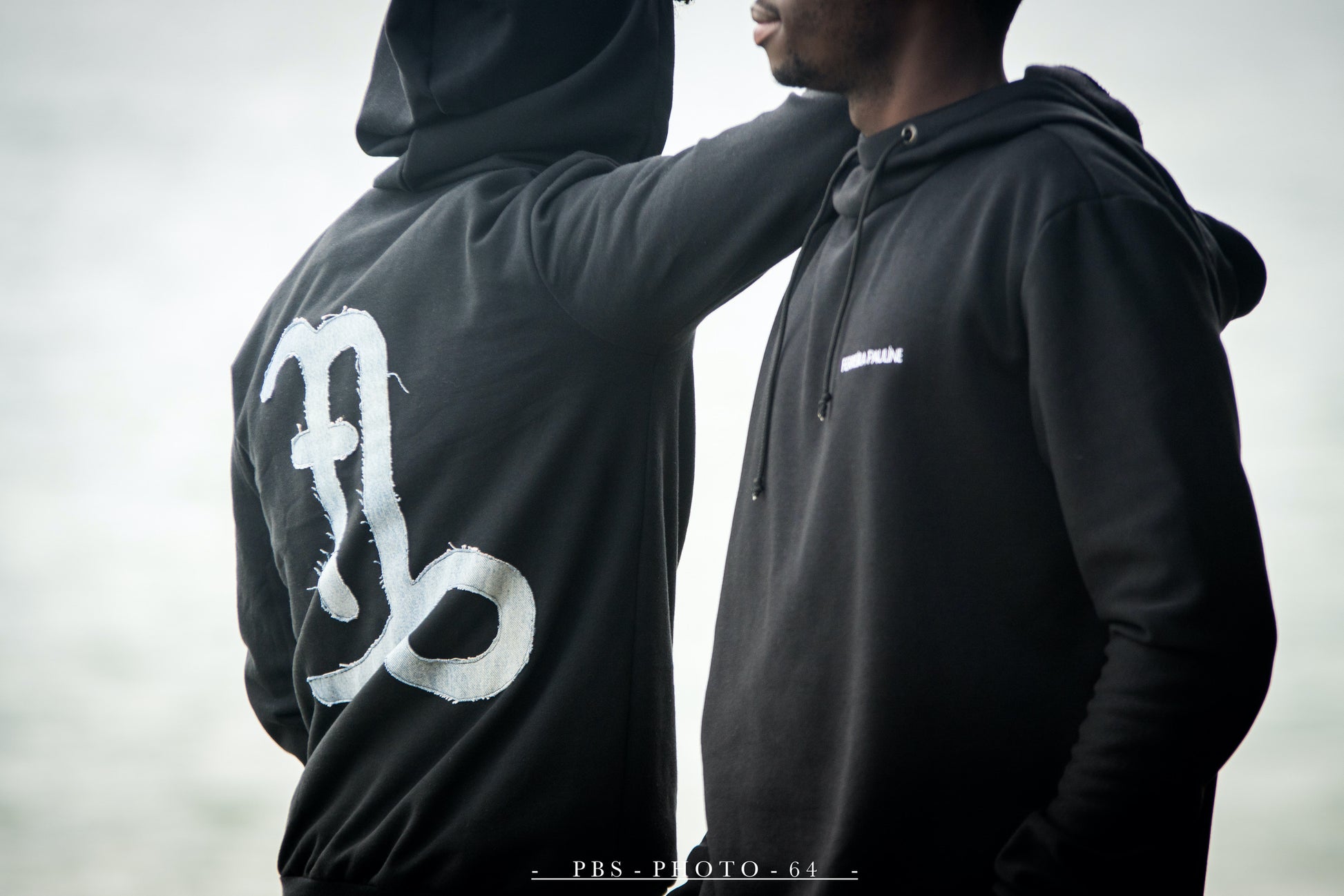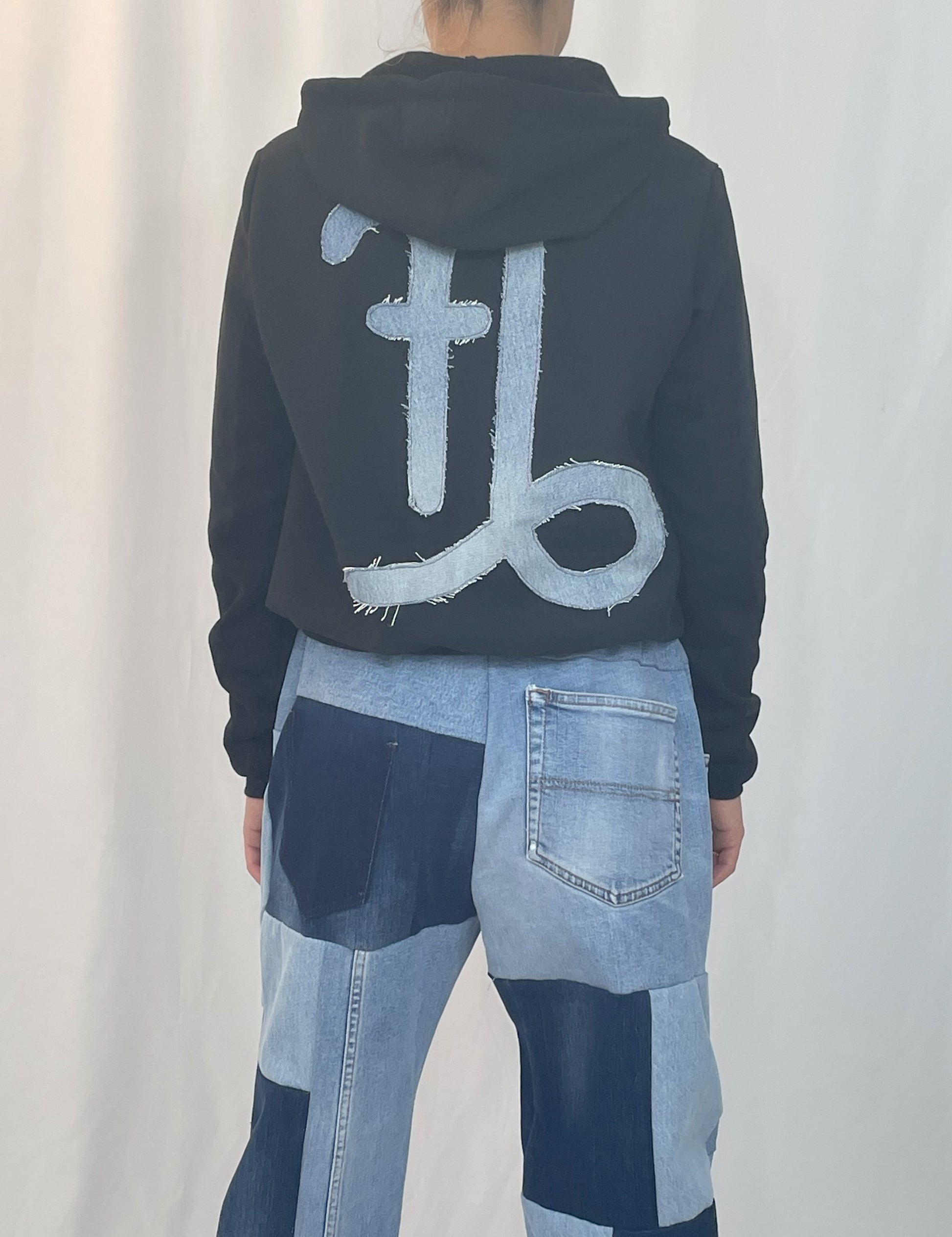 Sweat molleton noir, manche longue avec capuche. Détaille du logo en jean dans le dos. Très doux à l'intérieure.