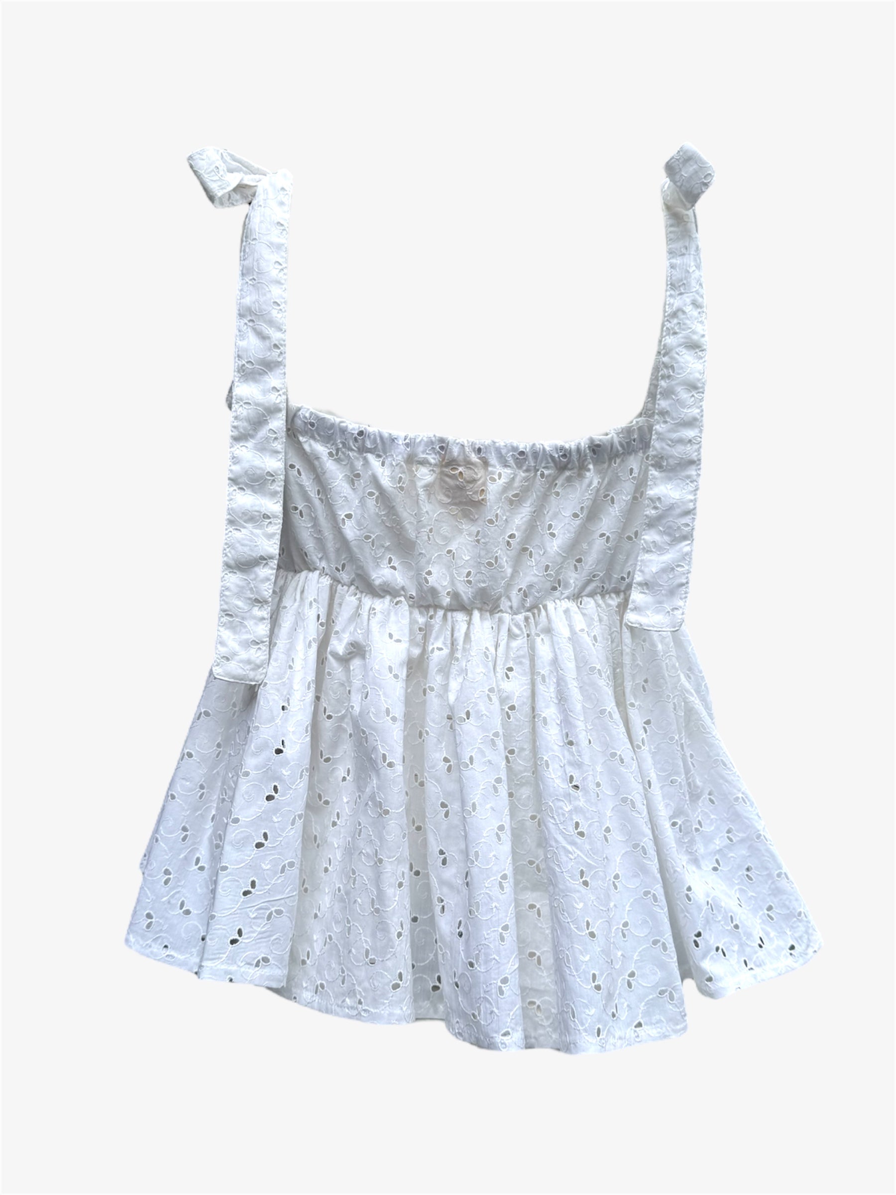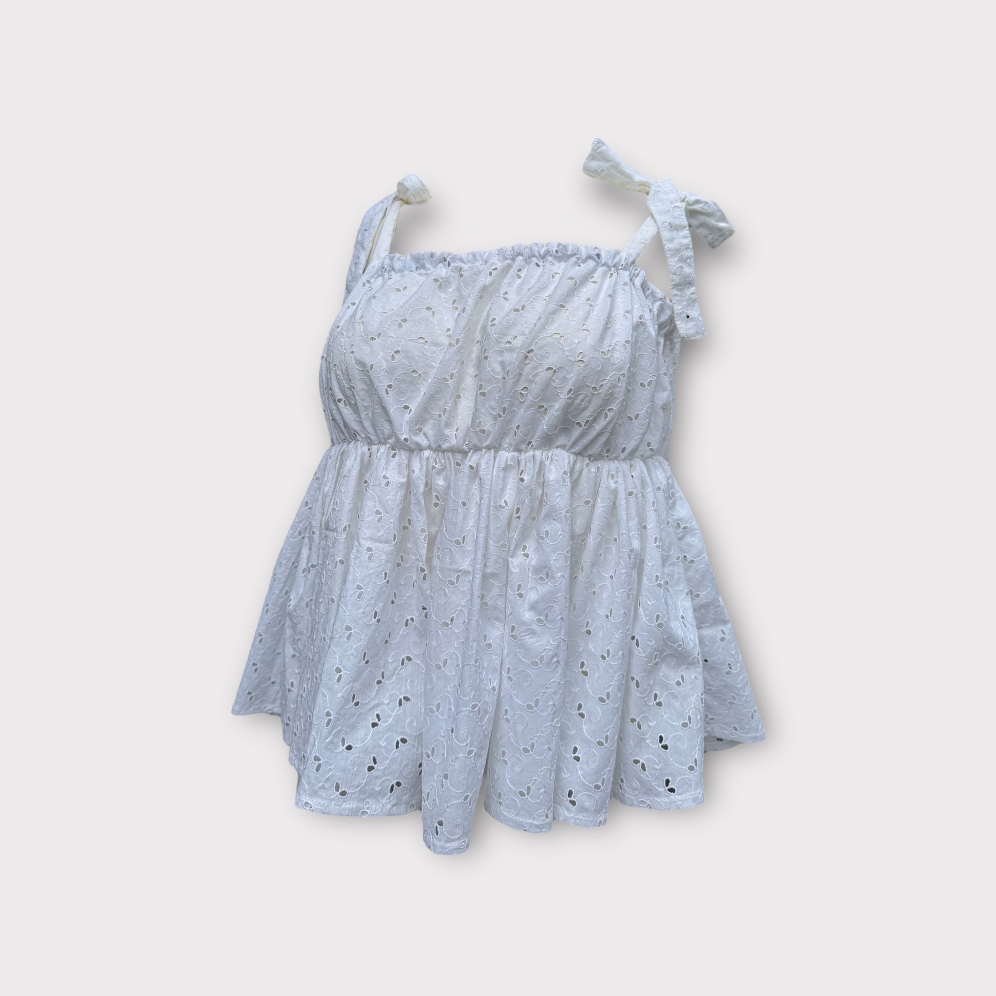 Top à volants en broderie anglaise blanche. Les bretelles sont à nouer. Une silhouette légère idéale pour les beaux jours.