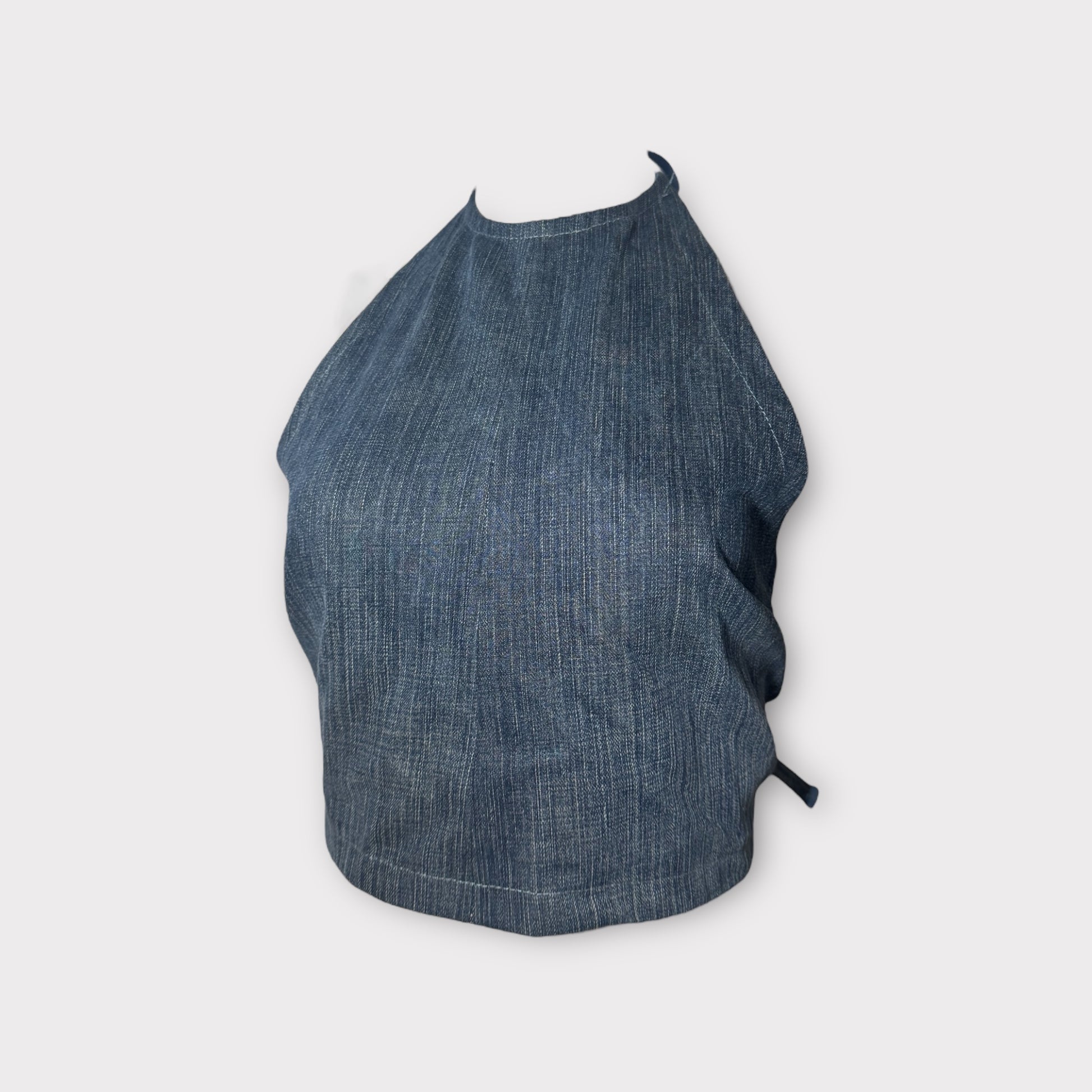 Top en jean recyclé à partir de jeans vintage, se noue dans le dos en laissent dévoilé le dos