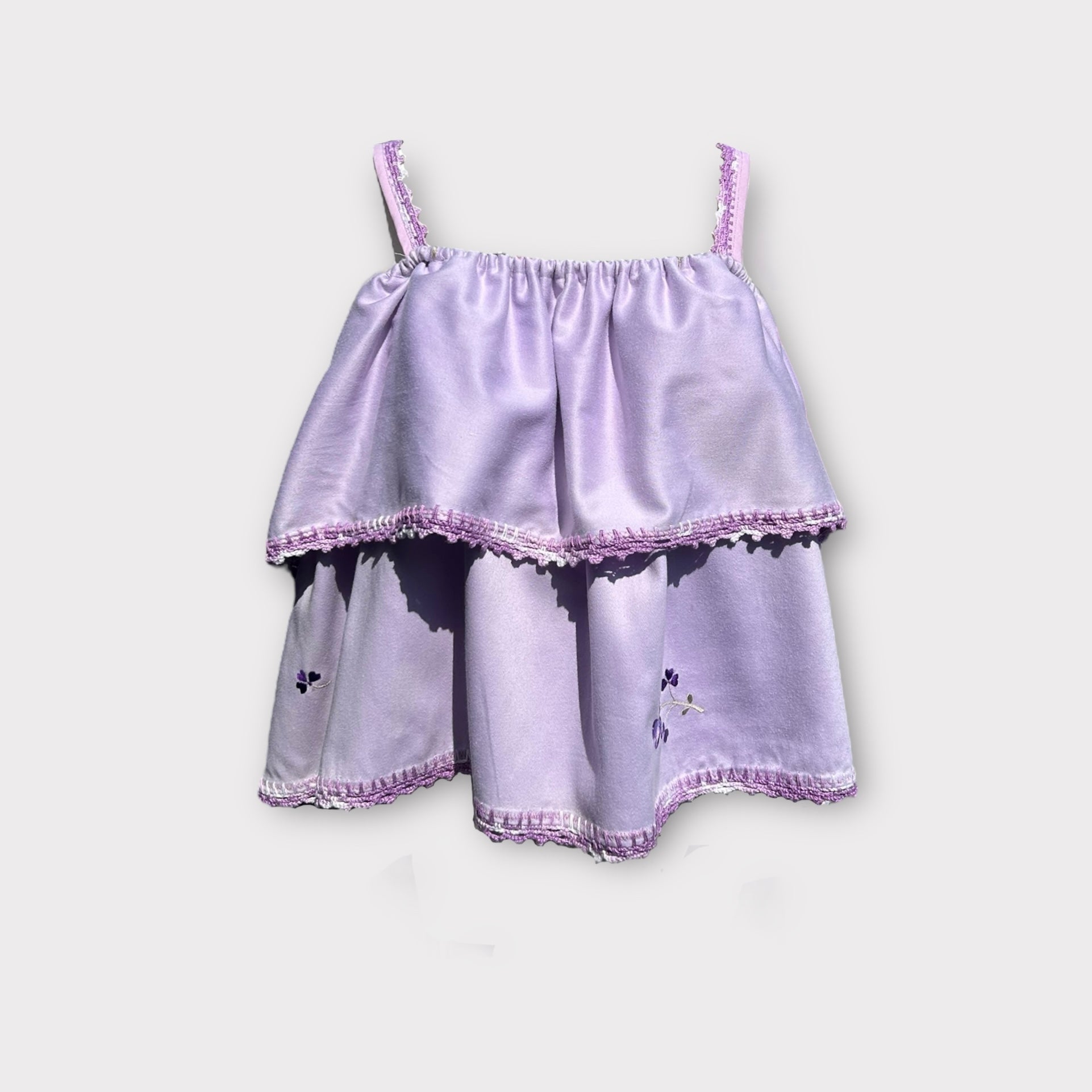 Top léger crée à partir d’un rideau au teinte mauve et fine brettelles. Deux volants au finition crocheté et des broderie de fleurs parsemé pur une silhouette douce et élégante. Son élasticité permet de s'adapter au tailles.