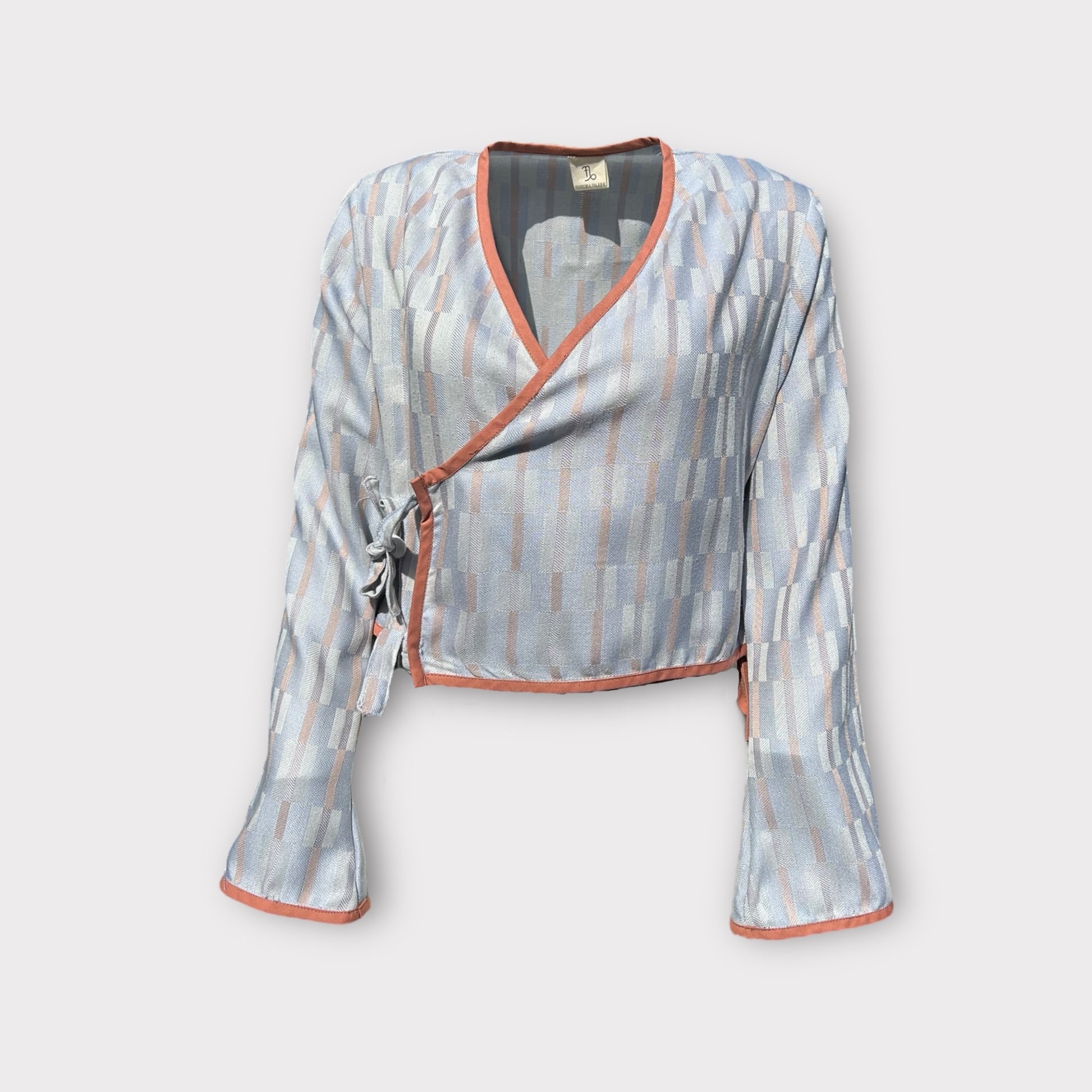 Top cache-cœur confectionné à partir d’un dessus de lit. Des manches évasées, léger et parfait pour le début de l’été.